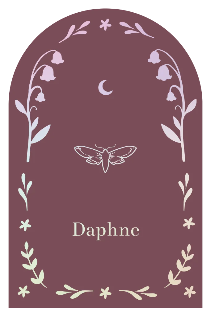 Een folklore, bohemian geboortekaartje in boogvorm. De blaadjes, bloemen en naam zijn afgewerkt in een licht paarse hoogglans, wat het kaartje een chique uitstraling geeft. Pas het ontwerp makkelijk aan in onze online editor.