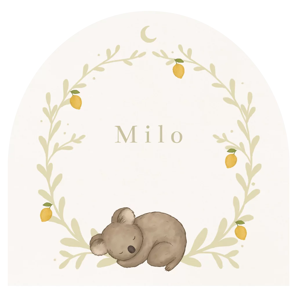Een zomers mediterraans geboortekaartje in een boogvorm. Op het kaartje staat een lieve illustratie van een slapende koala in een krans met citroentjes. Pas de kaart helemaal naar wens aan in onze online editor, bestel een proefdruk en bekijk dit kaartje in het echt!