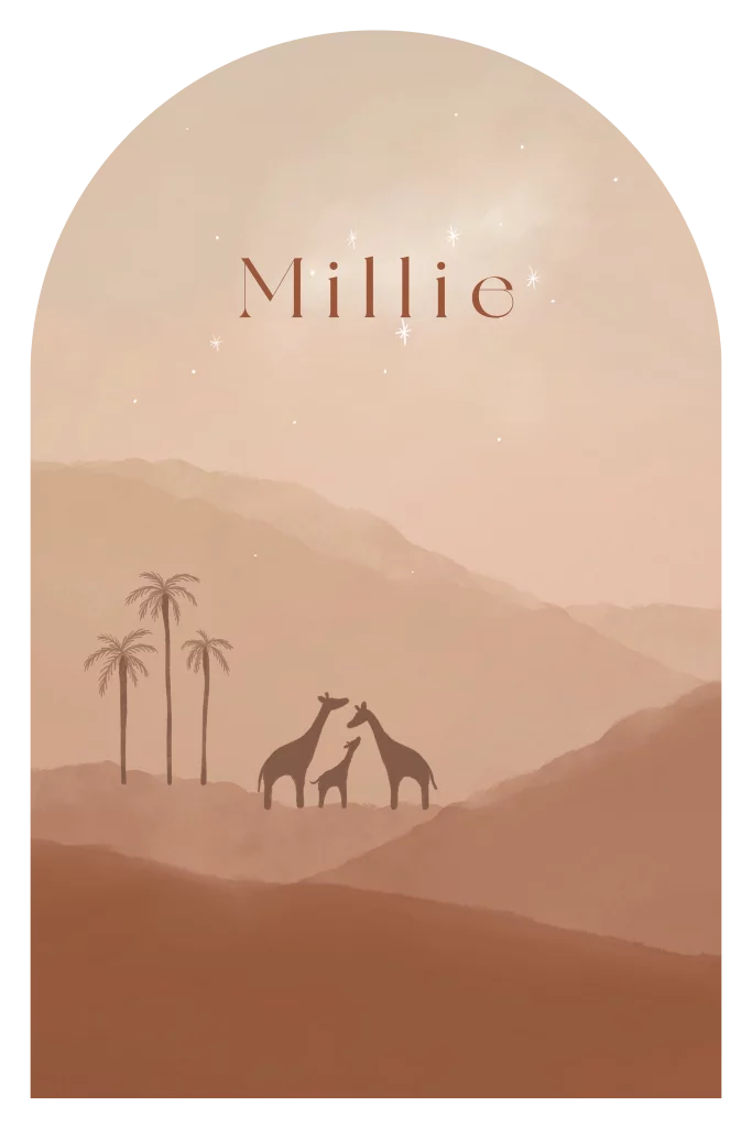 Een warme origineel geboortekaartje in boogvorm. Op het kaartje staat een illustratie van een savanne landschap, met palmbomen en een lief giraffen gezinnetje. Het kaartje heeft een 1001 nacht sfeer. Pas het gemakkelijk aan in onze editor!