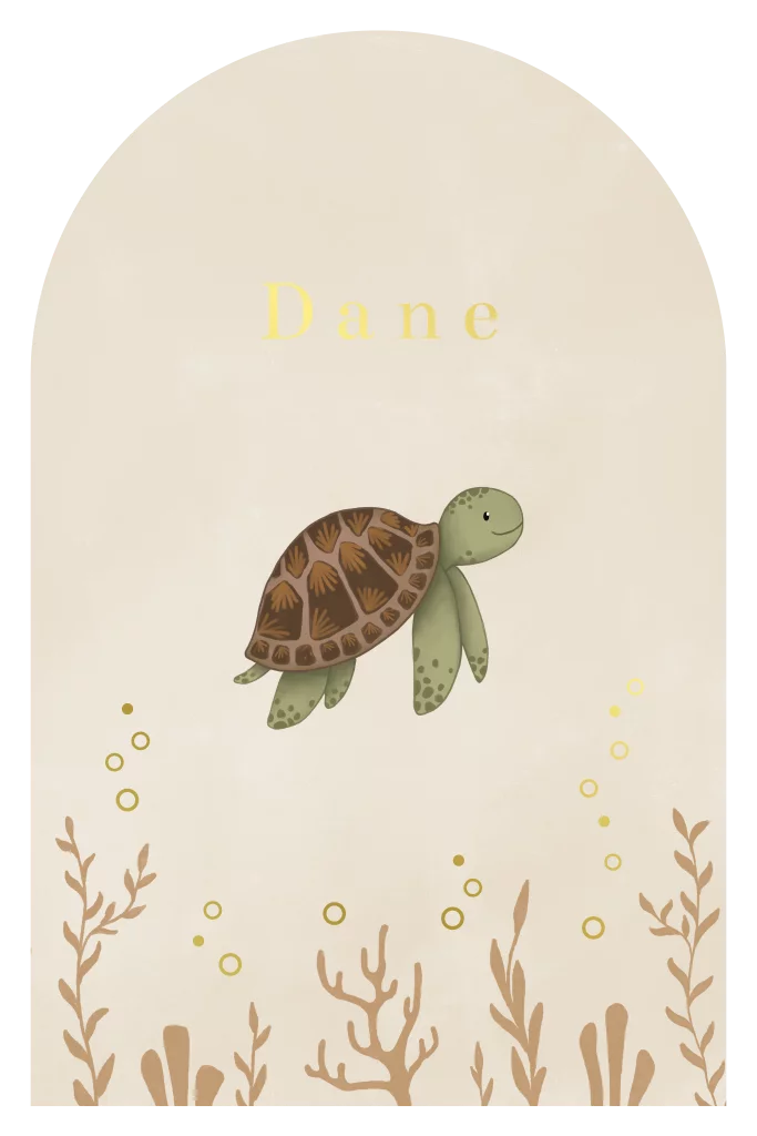 Een uniek geboortekaartje in boogvorm met een schattig schildpadje. Tussen het zeewier zijn kleine zeepbelletjes afgewerkt met glinsterend goudfolie. Pas het kaartje eenvoudig aan in onze online editor.