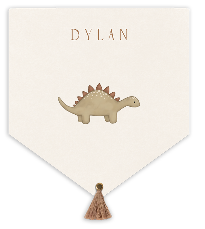 Een geboortekaartje in originele vorm van een banier/wandkleed. Op het kaartje staat een illustratie van een lieve, vrolijke dino. De kwastjes en splitpennen kun je gemakkelijk zelf toevoegen tijdens het bestelproces. Pas het ontwerp naar wens aan in onze online editor.