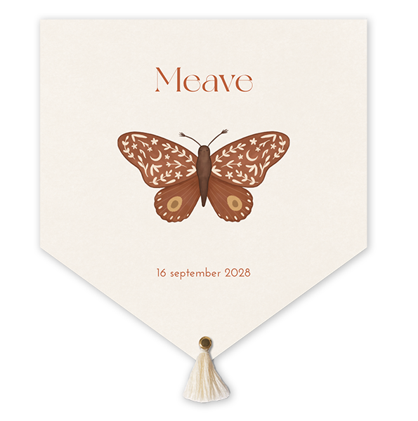 Vrolijk geboortekaartje in originele vorm van een banier/wandkleed. Op het kaartje staat een koperkleurige vlinder illustratie. De kwastjes en splitpennen kun je gemakkelijk zelf toevoegen tijdens het bestelproces. Pas het ontwerp naar wens aan in onze online editor.