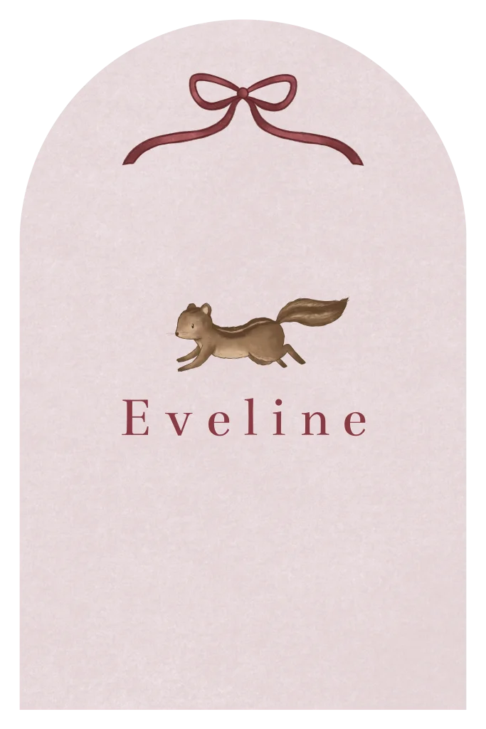 Geboortekaartje in boogvorm met een illustratie van een schattig eekhoorntje. De lila-roze achtergrond in combinatie met de bordeaux rode kleur van het strikje en de naam zorgen voor een warme, lieve uitstraling.
