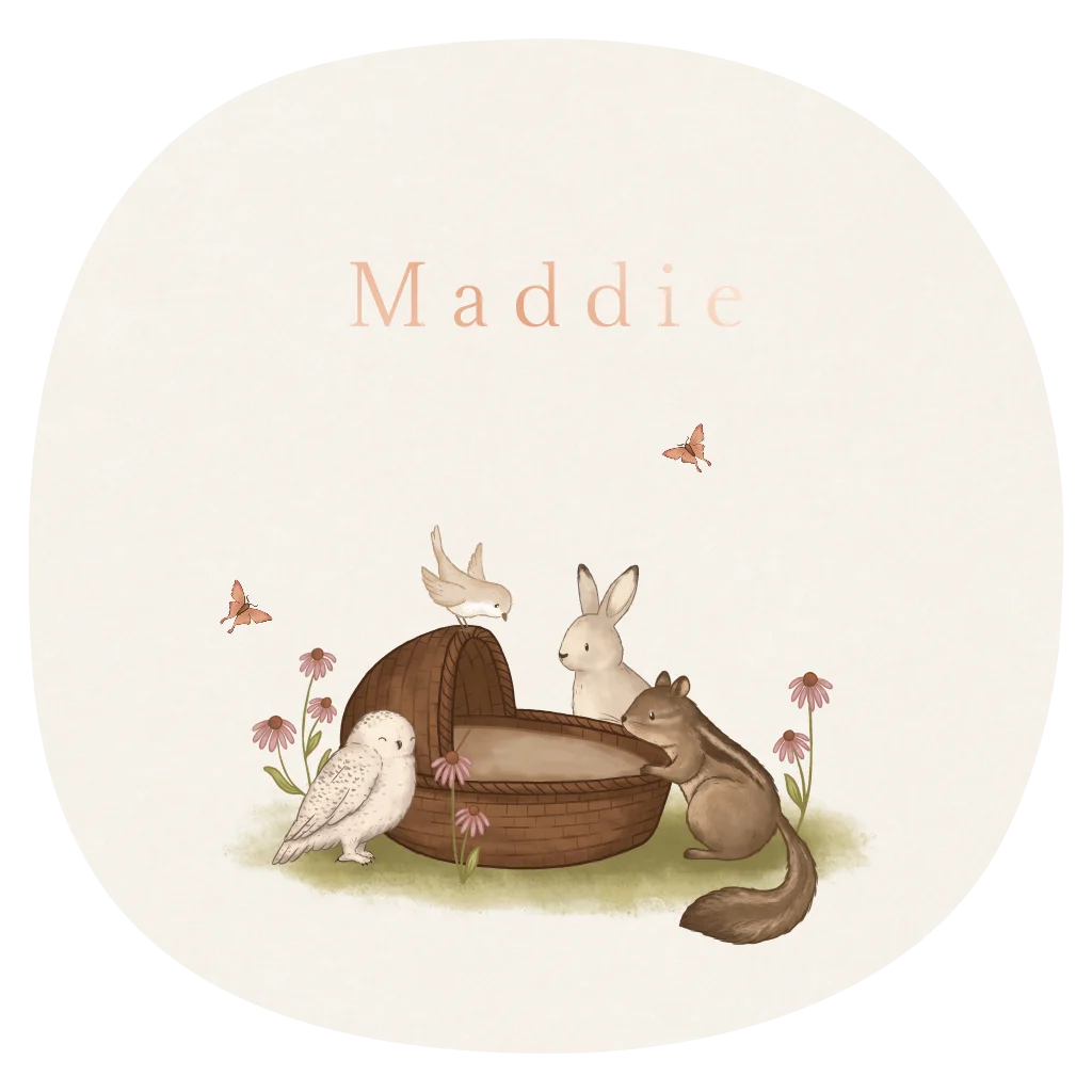 Vrolijk geboortekaartje in originele vorm. Op het kaartje staat een lieve illustratie van allemaal bosdieren bij een wiegje. De naam is in schitterende roségoudfolie. Pas het kaartje gemakkelijk aan in de online editor.