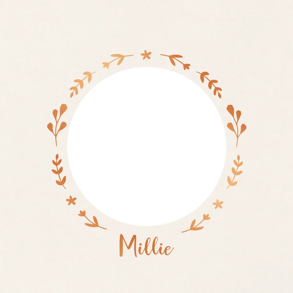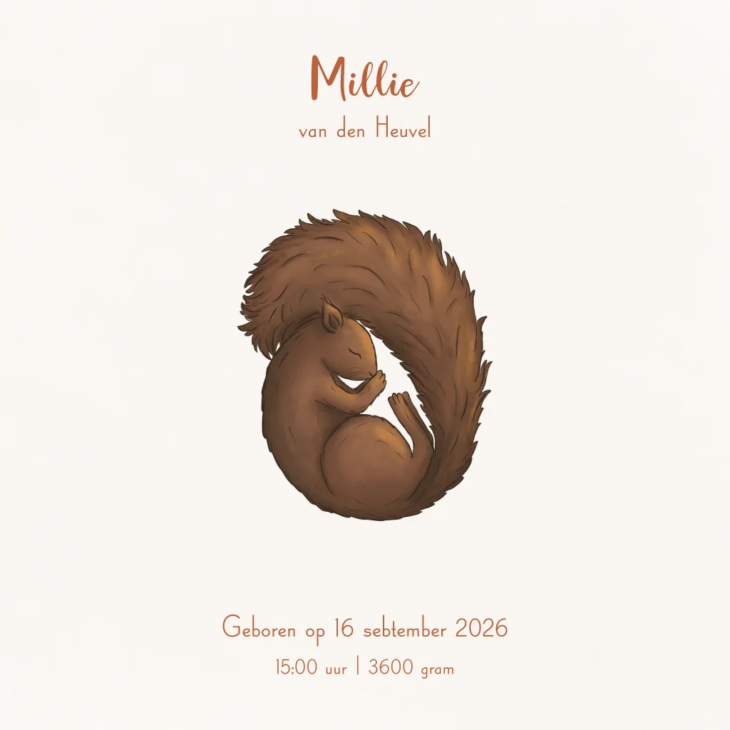 Een uniek geboortekaartje met een rond doorkijkje naar een eekhoorntje. Het lieve eekhoorntje ligt lekker te slapen. De rand van de gestanste cirkel is versierd met blaadjes en bloemetjes afgewerkt in koperfolie. Pas het kaartje gemakkelijk aan in de editor!