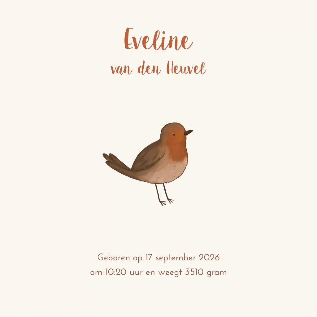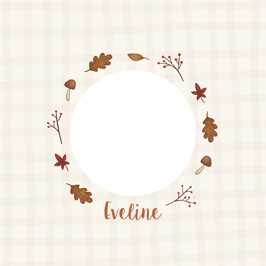 Geboortekaartje met een rond doorkijkje met een roodborstje. De cirkel van blaadjes, paddestoelen en takjes geeft het kaartje een warme, herfstige sfeer. Perfect als je kindje geboren wordt in de herfst. Op de achtergrond is een subtiel ruitjes patroon verwerkt.