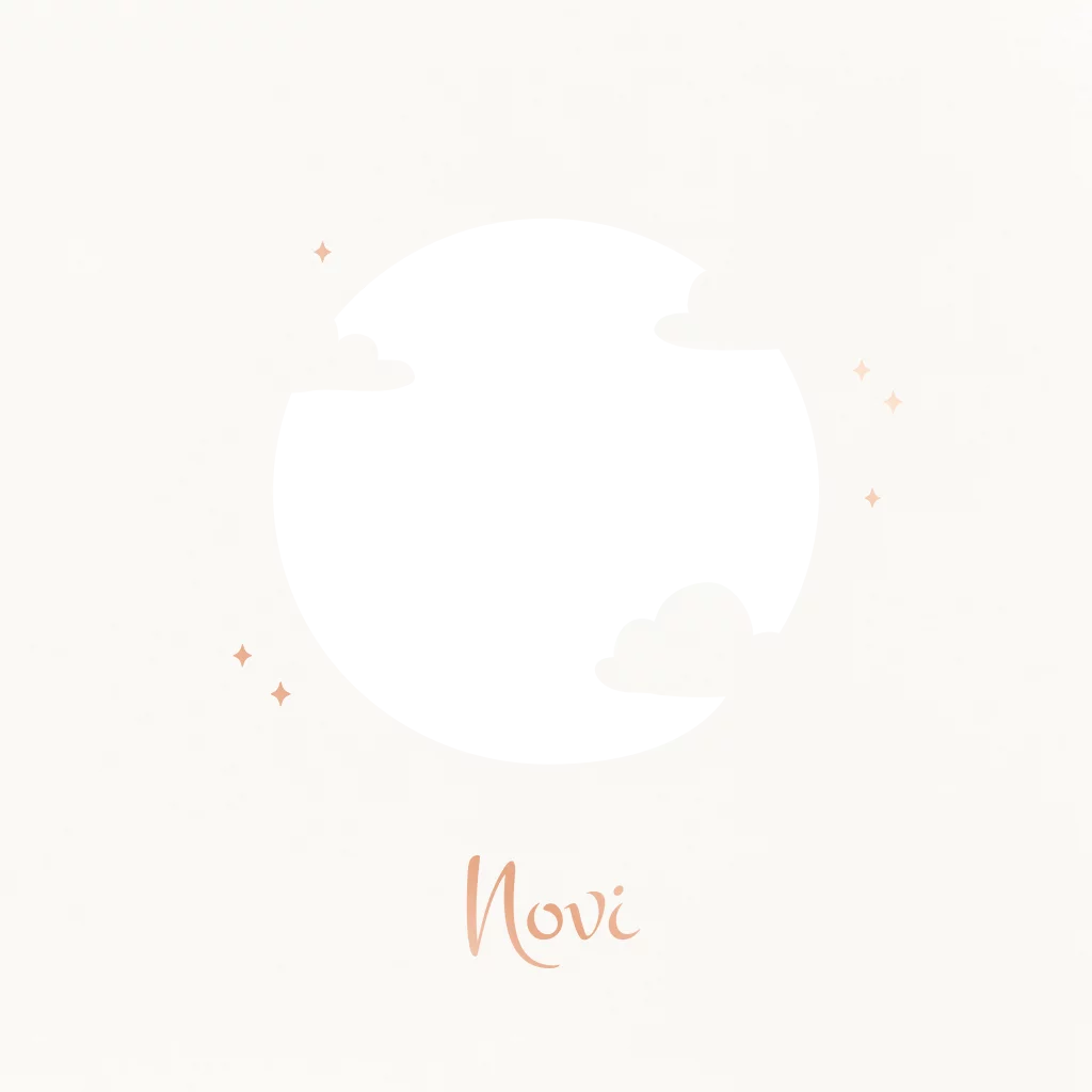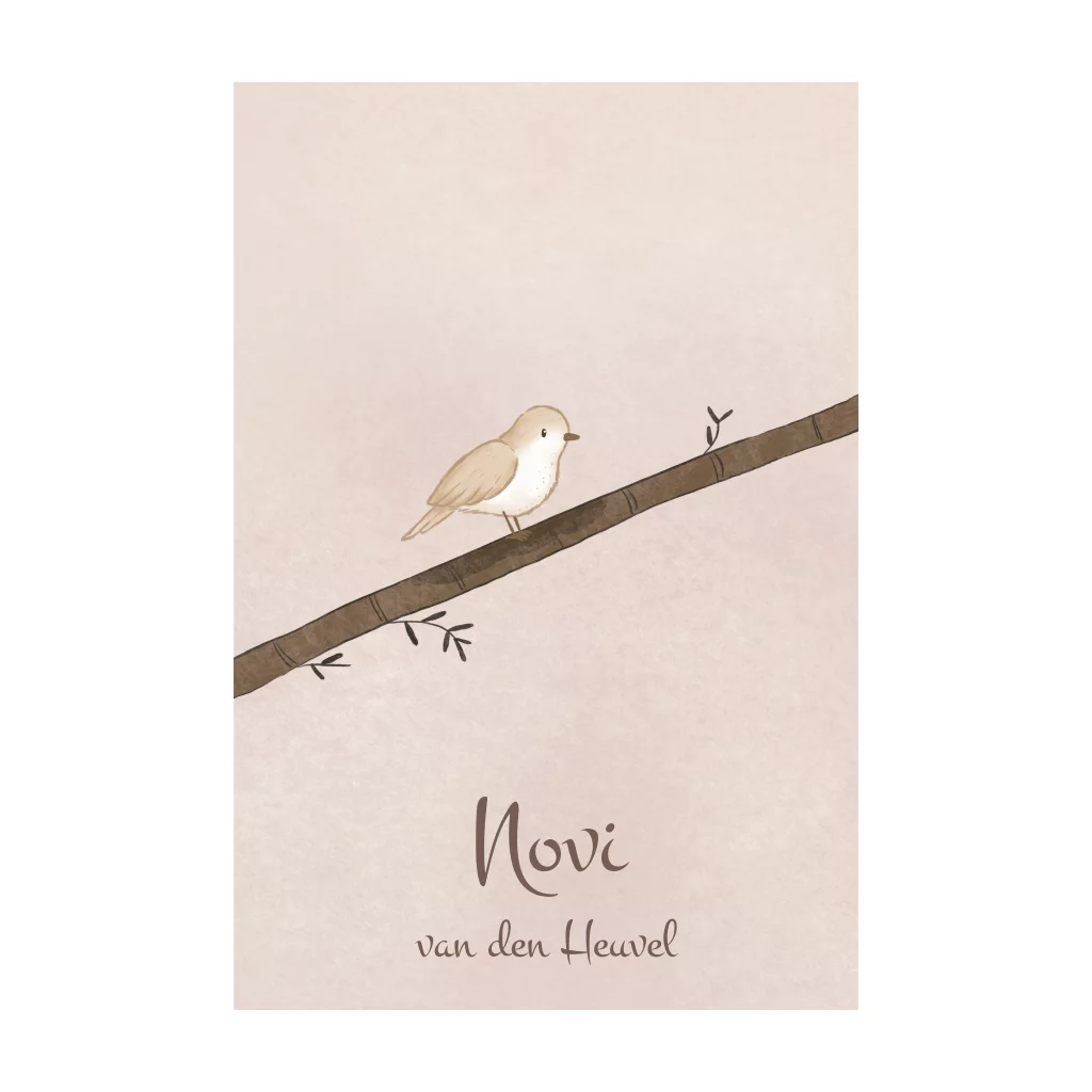 Een origineel, lief geboortekaartje met een rond doorkijkje. Bijzonder aan het doorkijkje is dat de wolken ook zijn uitgesneden. Dit geeft een speels effect aan het kaartje. In de binnenkant van staat een schattige illustratie van een vogeltje op een takje met een roze achtergrond. De naam en sterretjes zijn in roségoudfolie voor een magische uitstraling!