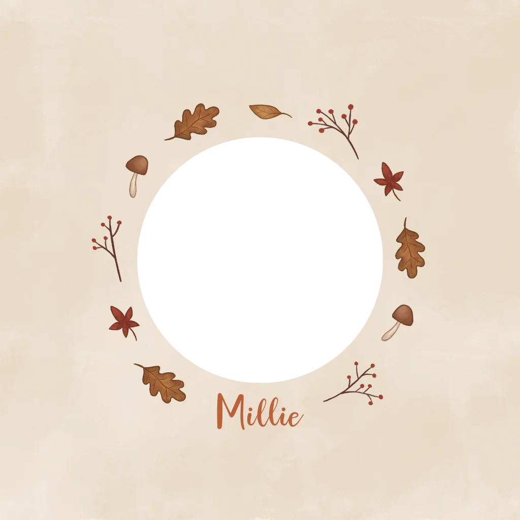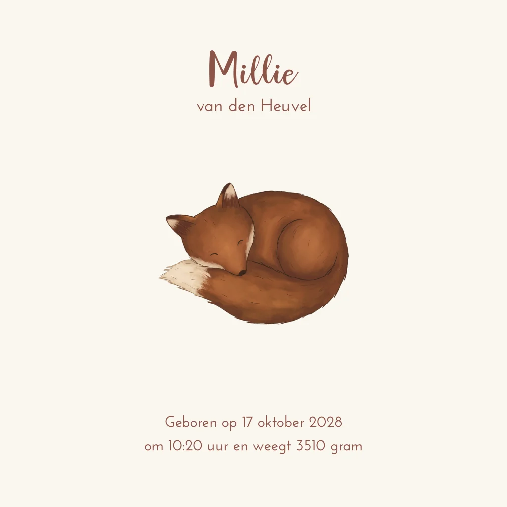 Geboortekaartje met een rond doorkijkje met een slapend vosje. De blaadjes, paddestoelen en takjes geven het kaartje een warme, herfstige sfeer. Perfect als je kindje geboren wordt in de herfst.
