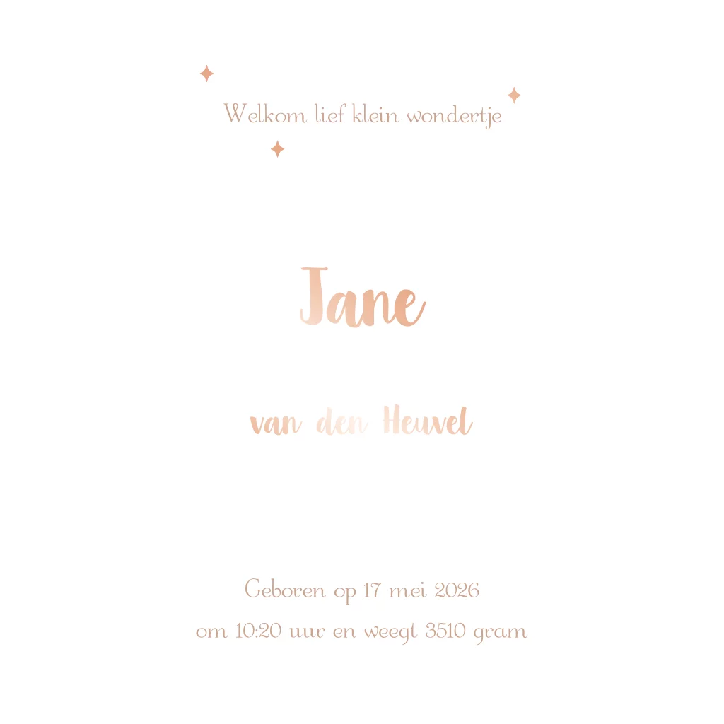 Geboortekaartje met doorkijkje van wolkjes. Een lief kaartje in een zacht roze kleur. De naam is afgewerkt in roségoudfolie.