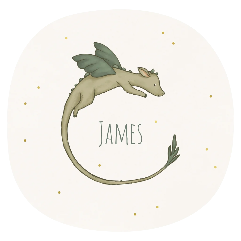 Sprookjesachtig geboortekaartje met een klein groen draakje, in een originele stans vorm. Het kaartje heeft een dromerig uitstraling. De goudfolie stippen voegen een vleugje magie toe.
