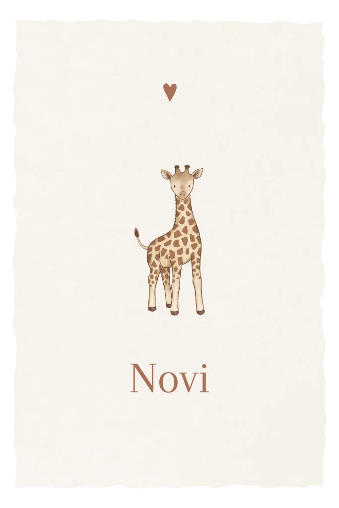 Een uniek geboortekaartje met een kartel rand, wat een uitstraling van handgeschept papier geeft. Voor een extra gevoel van handgeschept papier, kies voor de papiersoort linnen. Een minimalistische kaartje met een lieve illustratie van een girafje. Pas het kaartje eenvoudig aan in de editor.