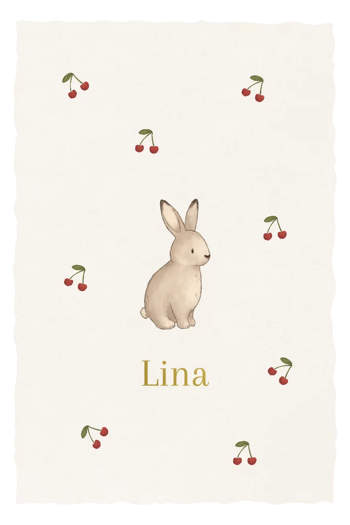 Een uniek geboortekaartje met een kartel rand, wat een uitstraling van handgeschept papier geeft. Voor een extra gevoel van handgeschept papier, kies voor de papiersoort linnen. Een lief kaartje met een illustratie van een konijntje en kersjes. Pas het kaartje eenvoudig aan in de editor.