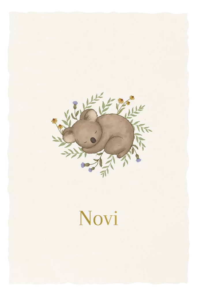 Uniek geboortekaartje met een kartelrand wat een geschept papier look geeft. Kies voor de papiersoort linnen, voor een extra handgeschepte uitstraling! Een lieve illustratie van een koala in een bedje van blaadjes en bloemen. De naam is afgewerkt met glinsterende goudfolie wat zorgt voor een luxe geboortekaartje.