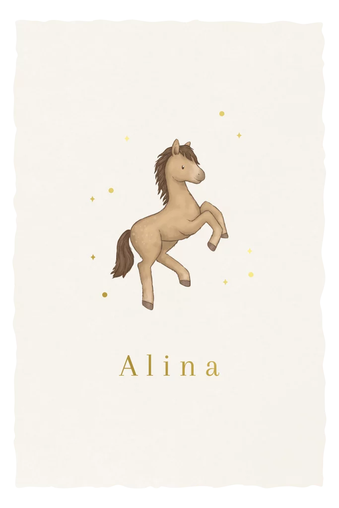 Uniek geboortekaartje met een kartelrand wat een geschept papier look geeft. Kies voor de papiersoort linnen, voor een extra handgeschepte uitstraling! Op het kaartje staat een lieve illustratie van een veulentje. De naam en stipjes zijn afgewerkt met glinsterende goudfolie.