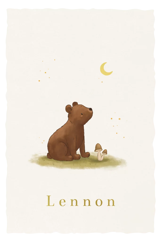 Uniek geboortekaartje met een kartelrand wat een geschept papier look geeft. Kies voor de papiersoort linnen, voor een extra handgeschepte uitstraling! Op het kaartje staat een lieve illustratie van een beertje. De naam en het maantje zijn afgewerkt in een glinsterende goudfolie.