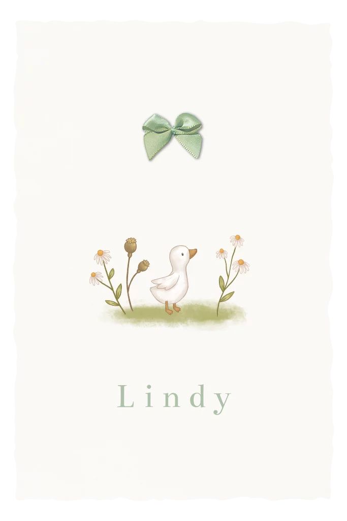 Uniek geboortekaartje met een kartelrand wat een geschept papier look geeft. Kies voor de papiersoort linnen, voor een extra handgeschepte uitstraling! Op het kaartje staat een lieve illustratie van een gansje tussen de bloementjes.