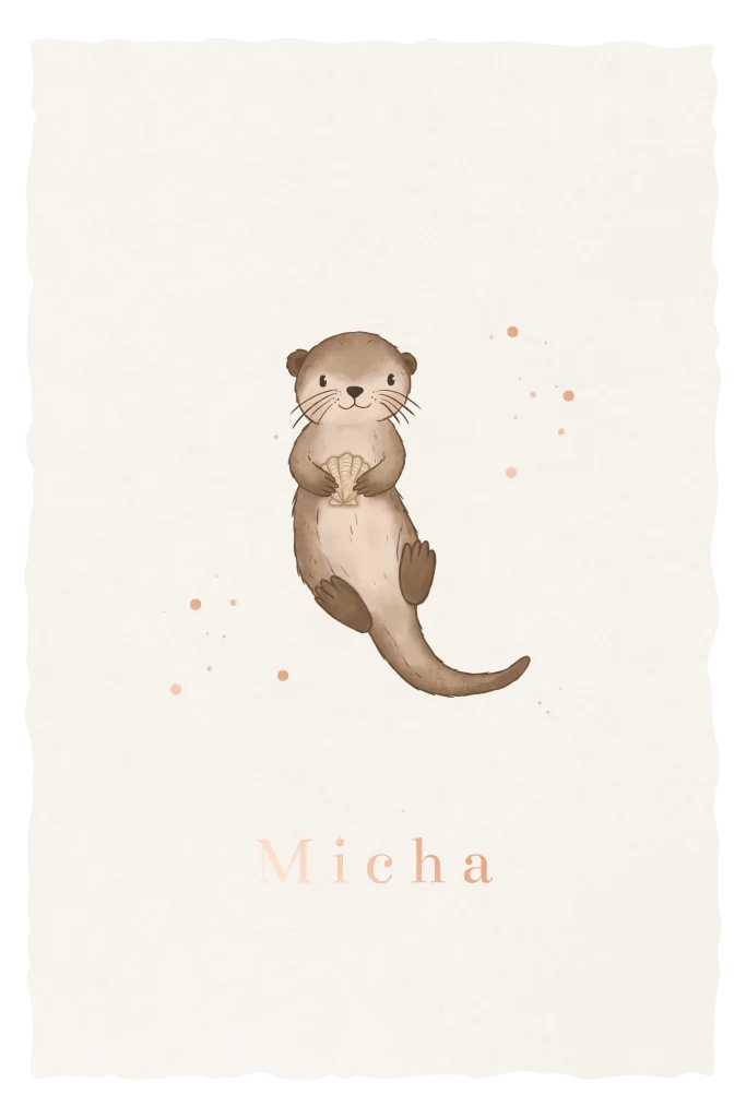 Uniek geboortekaartje met een kartelrand wat een geschept papier look geeft. Kies voor de papiersoort linnen, voor een extra handgeschepte uitstraling! Op het kaartje staat een lieve illustratie van een otter. De naam is afgewerkt in een glinsterende roségoudfolie.