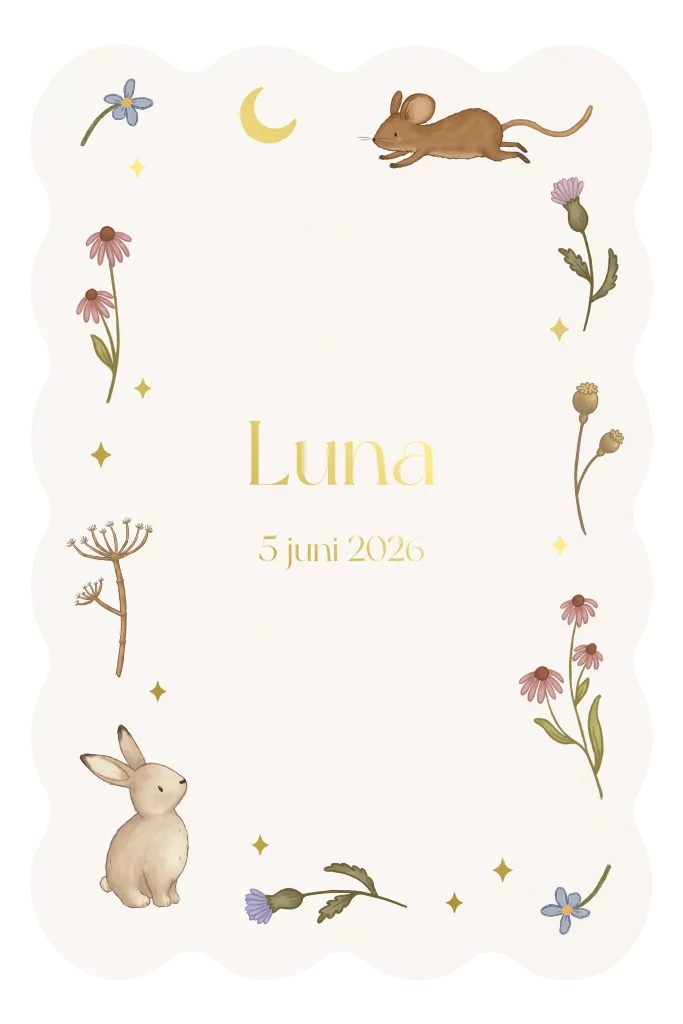 Een uniek geboortekaartje met een golvende rand. Een vrolijk kaartje met bloemetjes en diertjes. Het maantje, sterretjes en de naam zijn afgewerkt in goudfolie.