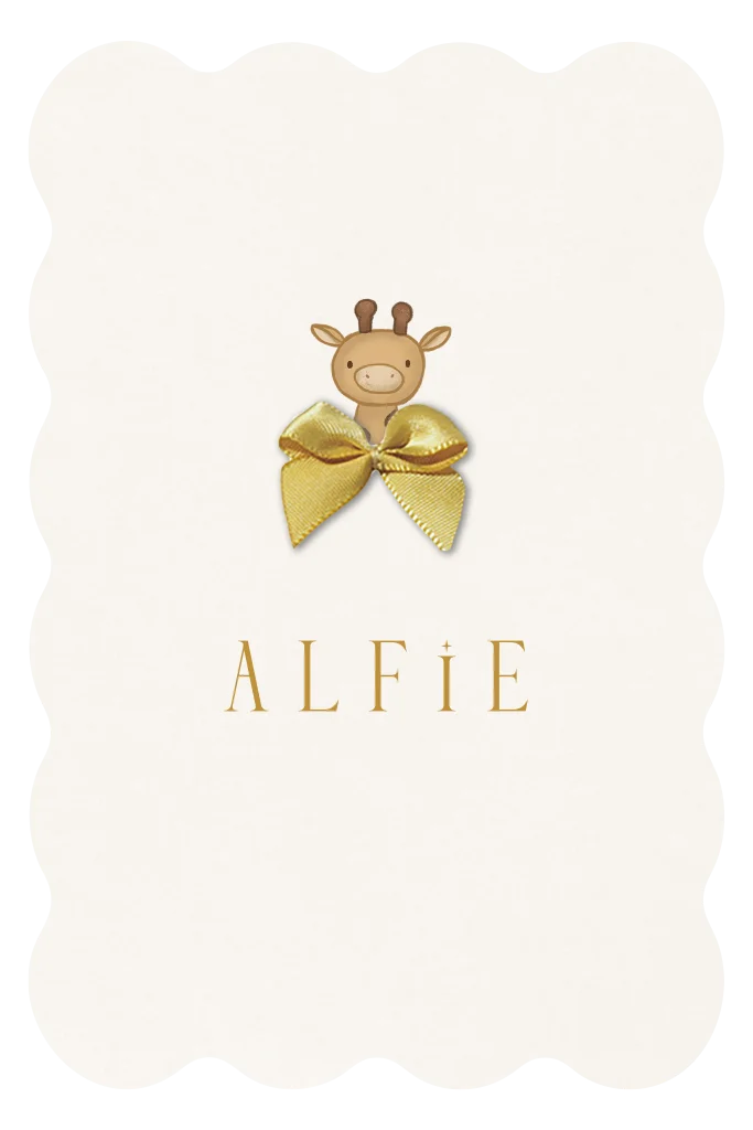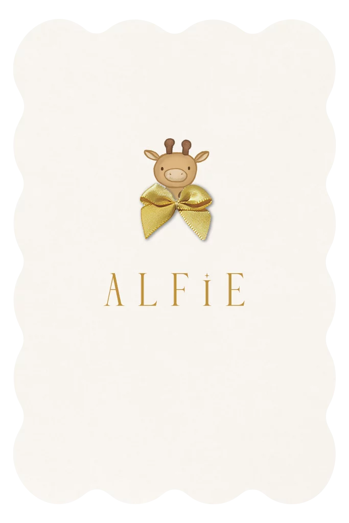 Een uniek geboortekaartje met een golvende rand. Op het kaartje staat een illustratie van een lief girafje. Het gouden satijnen strikje voeg je gemakkelijk zelf toe tijdens het bestelproces. Personaliseer naar wens in onze online editor.