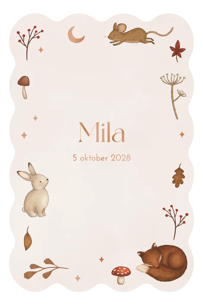 Lief, origineel geboortekaartje met golvende rand. Het kaartje is in herfst thema met illustraties van bosdiertjes. De naam en sterretjes zijn in een koperkleurige hoogglans. Pas het ontwerp eenvoudig aan in onze editor.