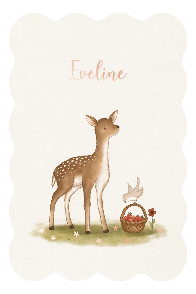 Een lief, lente geboortekaartje met een hertje. Naast het hertje staat een mandje met aardbeitjes met een nieuwsgierig vogeltje bovenop. Het kaartje heeft een golvende rand rondom. De naam en bloemetjes in het gras zijn afgewerkt met roségoudfolie.