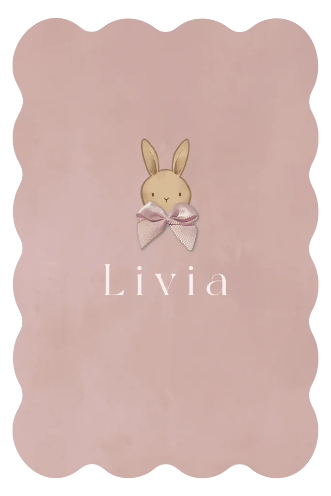 Een uniek geboortekaartje met een golvende rand. Op het kaartje staat een illustratie van een lief konijntje. Het oudroze satijnen strikje voeg je gemakkelijk zelf toe tijdens het bestelproces. Personaliseer naar wens in onze online editor.