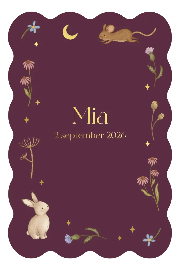 Een uniek geboortekaartje met een golvende rand. De diepe paarse kleur in combinatie met de bloemetjes en diertjes geeft het kaartje een folklore uitstraling. Het maantje, sterretjes en de naam zijn afgewerkt in goudfolie.