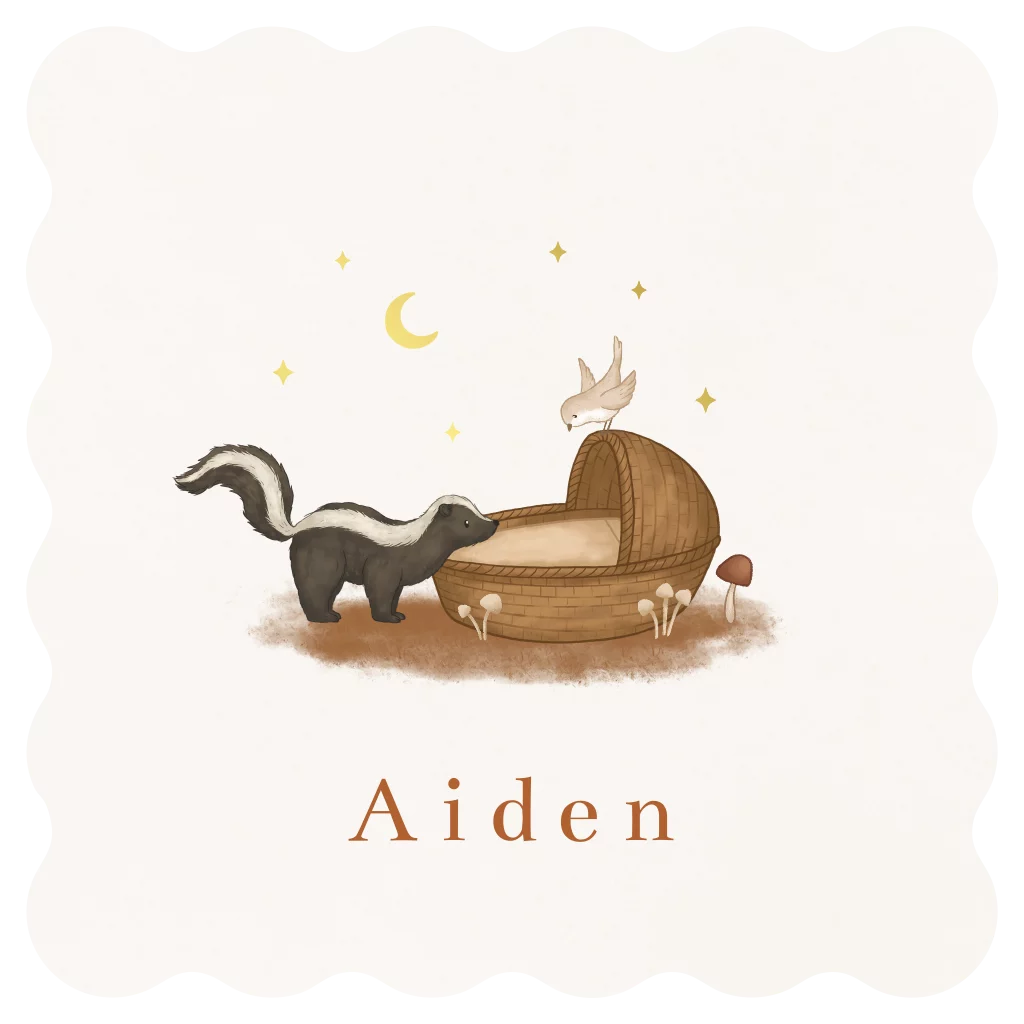 Lief geboortekaartje met een wiegje in het bos waar een nieuwsgierig stinkdiertje en vogeltje bij zitten. De herfstige tinten geven dit kaartje een warme uitstraling. De sterretjes en het maantje zijn afgewerkt in een prachtige goudfolie. Pas het kaartje eenvoudig aan in onze online editor.