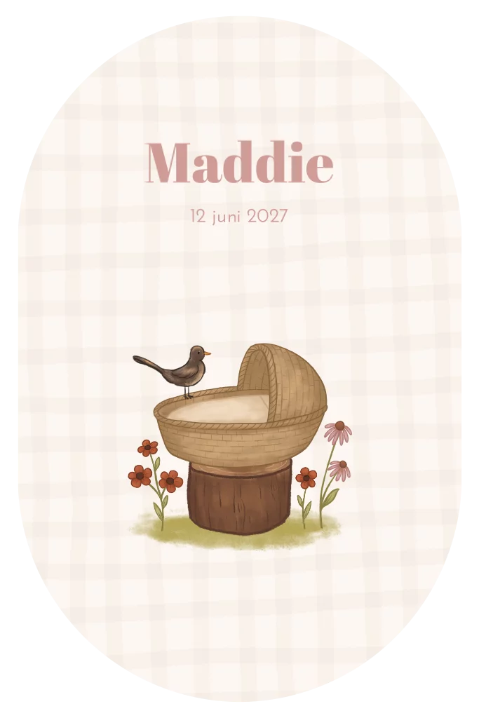 Een ovaal geboortekaartje met een wiegje in de lente. De achtergrond van het kaartje heeft een schattig ruitjes patroon. Wat zorgt voor een cottagecore uitstraling. Pas het vogeltje en de bloementjes gemakkelijk aan in de editor. Mis je een illustratie? Neem contact met ons op, wij maken graag een illustratie op maat!