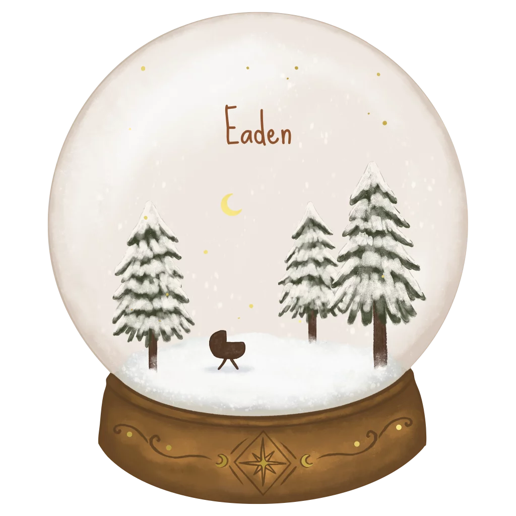 Uniek winters geboortekaartje in originele vorm van een snowglobe. In de snowglobe is een winterlandschap te zien met een wiegje. De goudfolie details zorgen voor een magische uitstraling! Personaliseer het kaartje eenvoudig in onze online editor.