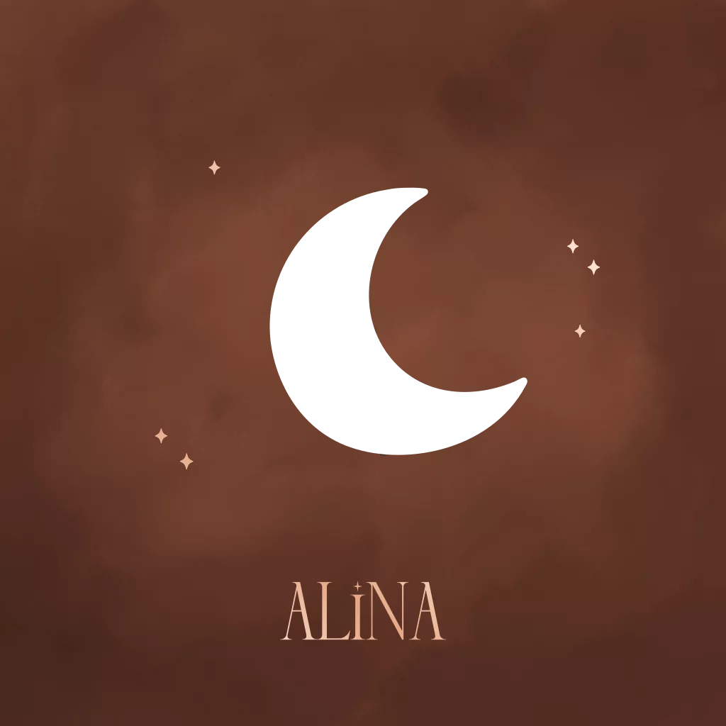 Een origineel dromerig geboortekaartje met een doorkijkje van een maan. De roodbruine kleur op de achtergrond zorgt voor een warme uitstraling. De naam en sterretjes zijn in glinsterende roségoudfolie voor een magisch effect.