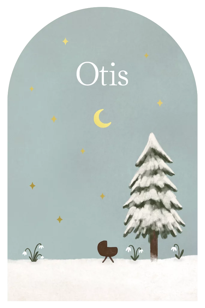 Een winters geboortekaartje van een sneeuwlandschap op een boogvorm kaartje. Het maantje en de sterren zijn afgewerkt met goudfolie.