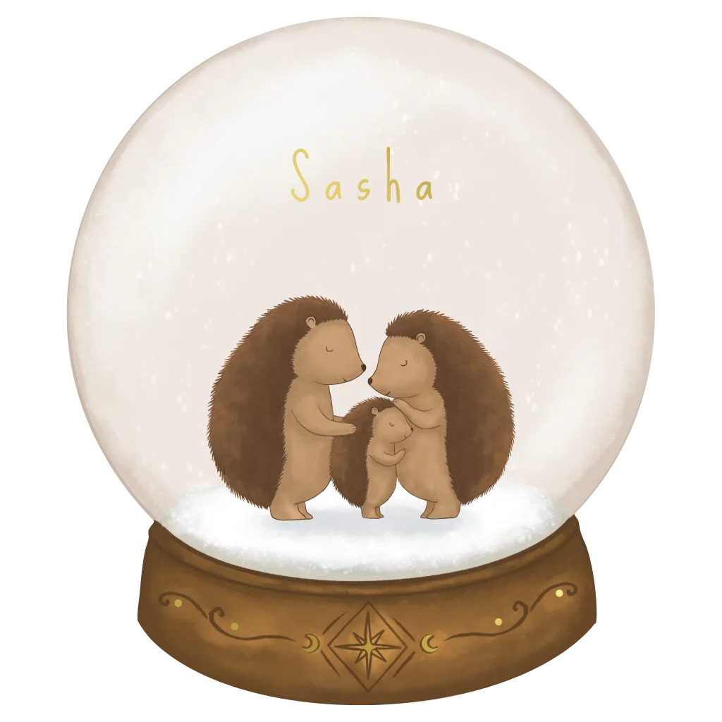Uniek winters geboortekaartje in originele vorm van een snowglobe. In de snowglobe staat een lief egel gezinnetje. De naam en de versiering in het hout, is in goudfolie. Een warm, magisch kaartje perfect voor een winter kindje! Personaliseer het kaartje eenvoudig in onze online editor.
