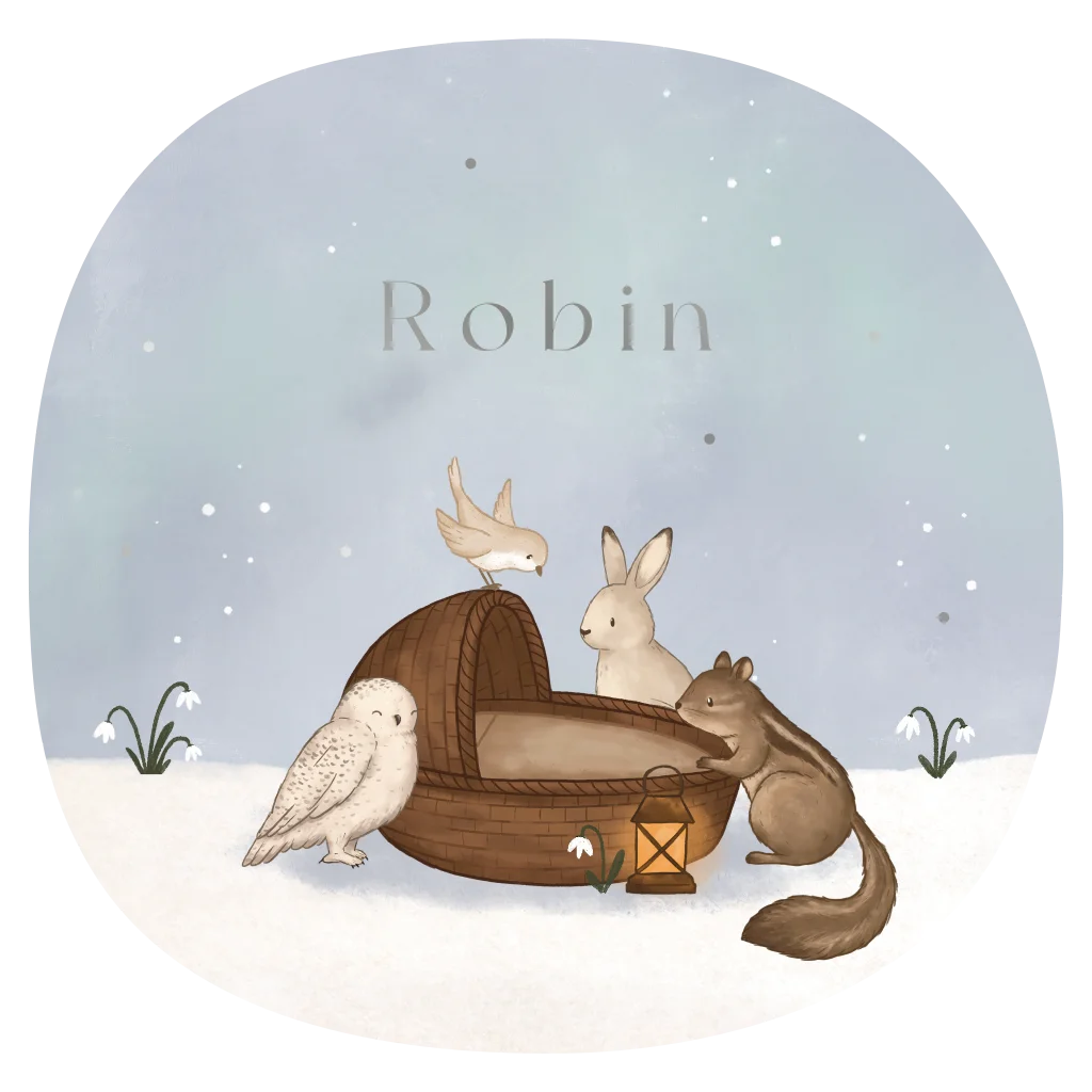 Lief winters geboortekaartje met een wiegje en bosdiertjes. De sneeuw, sneeuwklokjes en het lantaarntje geeft het kaartje een echte winterse uitstraling. In combinatie met de zilverfolie stipjes en naam is het een sprookjesachtig kaartje! Pas het kaartje eenvoudig aan in onze editor.