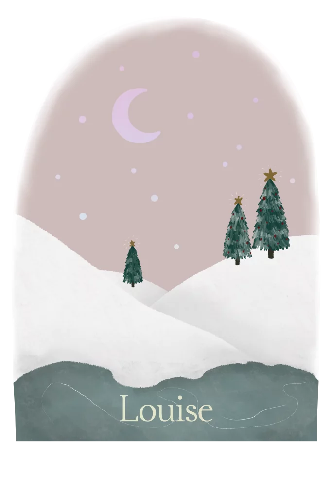 Een winters geboortekaartje met een sneeuwlandschap. Het kaartje is in een boog vorm, wat zorgt voor een soort sneeuwbol effect. Het kaartje is afgewerkt met details in holografisch folie.