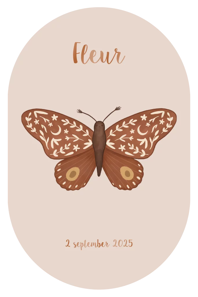 Ovaal geboortekaartje met een illustratie van een vlinder in folklore stijl. De naam is afgewerkt in een hoogglans roest kleur. De roze achtergrond zorgt voor een warme en lieve uitstraling.