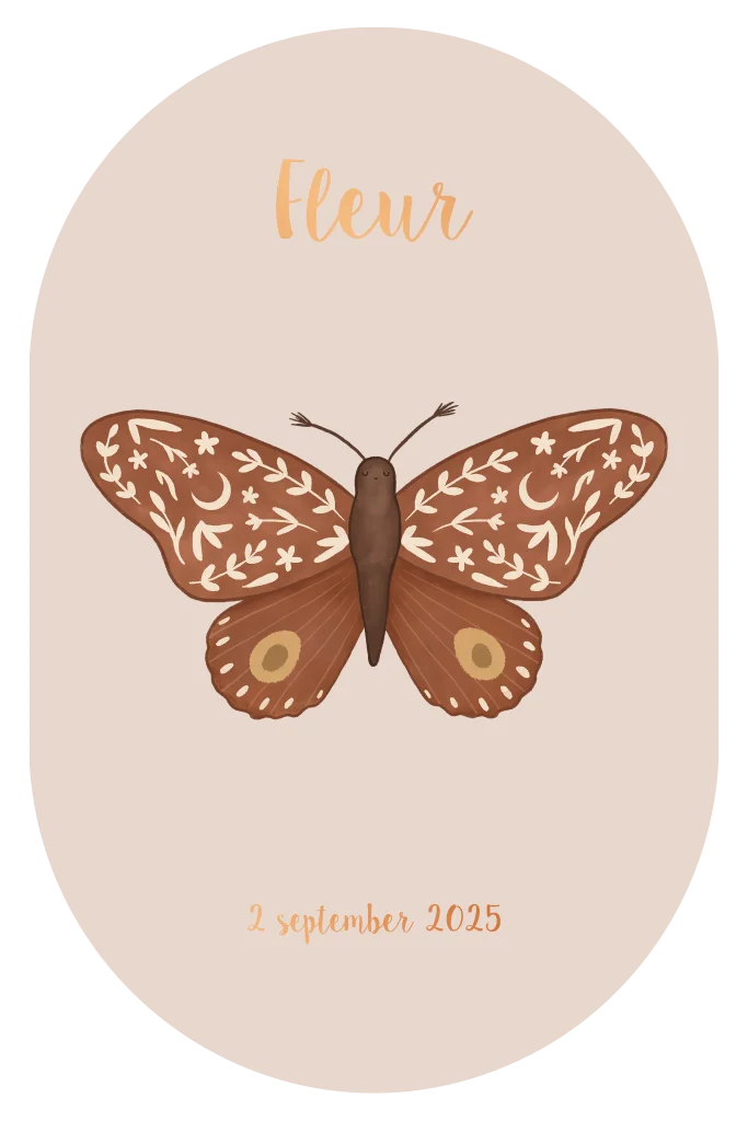 Ovaal geboortekaartje met een illustratie van een vlinder in folklore stijl. De naam is afgewerkt in een koperfolie. De roze achtergrond zorgt voor een warme en lieve uitstraling.