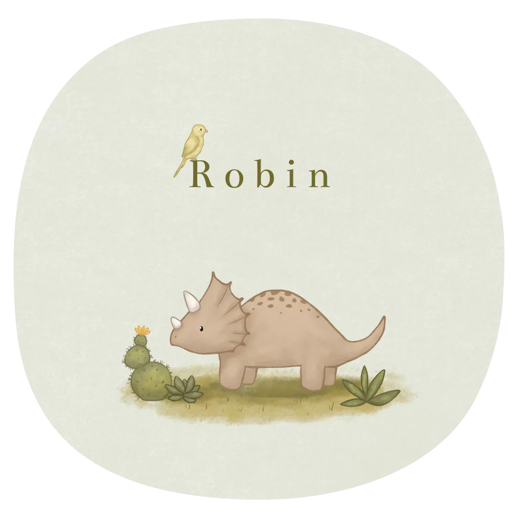Uniek rond geboortekaartje met een dino omringd door cactussen. Op de naam zit een groen parkietje. Pas het kaartje gemakkelijk aan in onze editor!