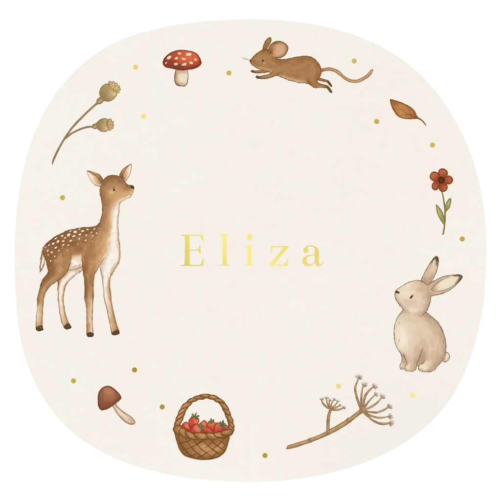 Een speels rond geboortekaartje met bosdiertjes. Een lief en warm geboortekaartje in herfst thema. De stipjes en naam zijn in goudfolie, wat zorgt voor een twinkelend effect. Pas eenvoudig het kaartje aan in de editor.