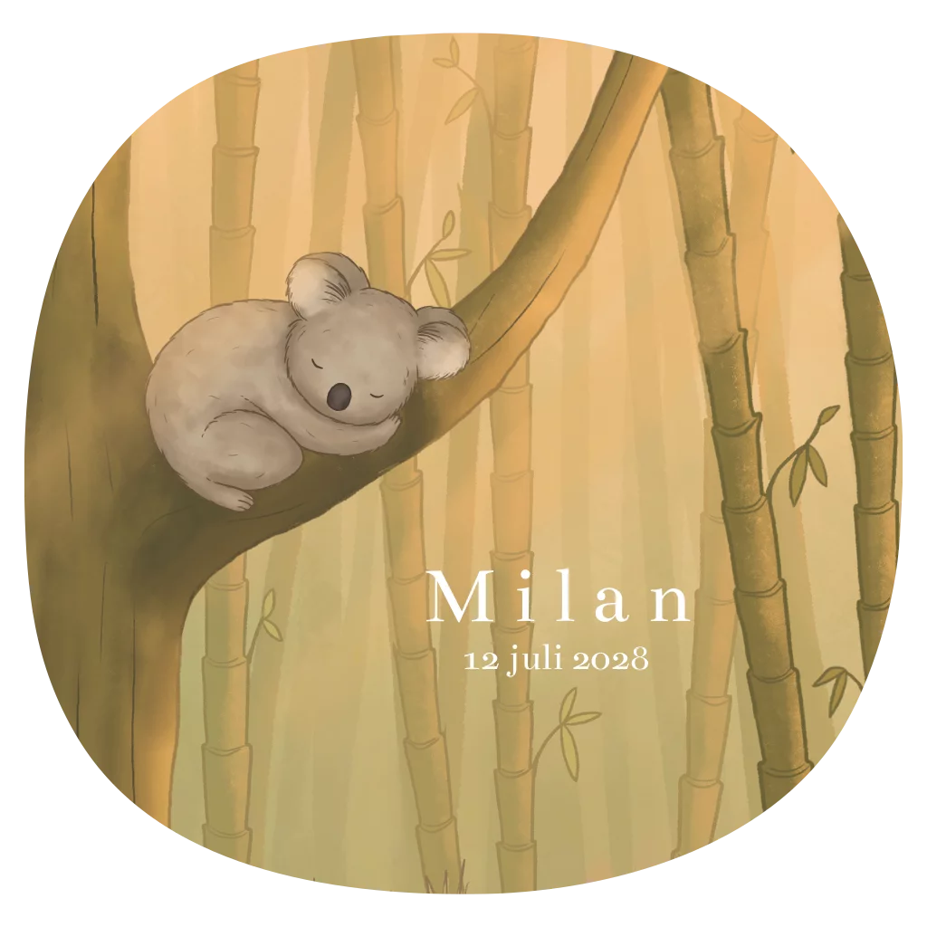 Een lief geboortekaartje met een illustratie van een bamboebos waar een koala lekker ligt te slapen in een boom. Het prachtige avondzonnetje zorgt voor een warm geheel. Pas het kaartje gemakkelijk aan in onze editor!