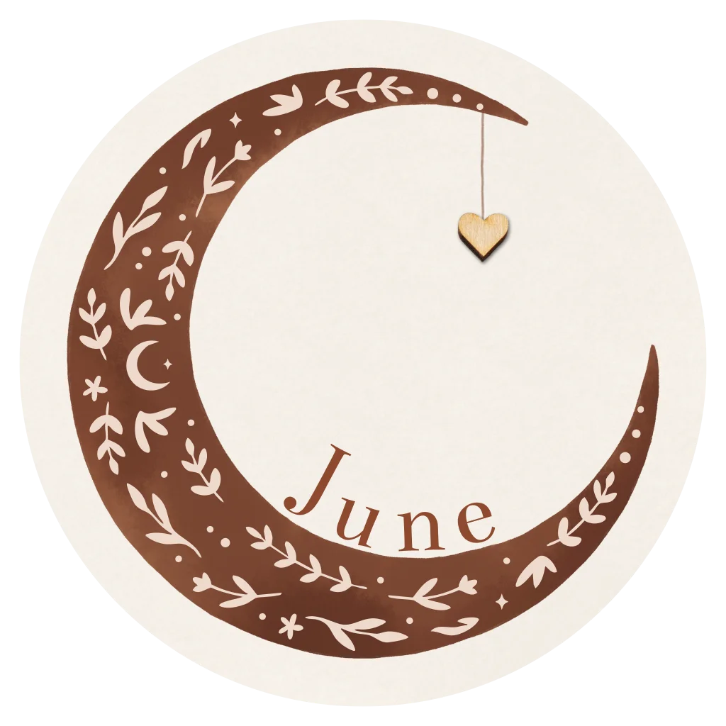 Geboortekaartje in ronde stans vorm met een illustratie van een maan. Op de maan staan details van blaadjes en bloementjes, wat het kaartje een folklore uitstraling geeft. Maak het kaartje af met een houten hartje, deze kun je gemakkelijk zelf toevoegen tijdens het bestelproces.