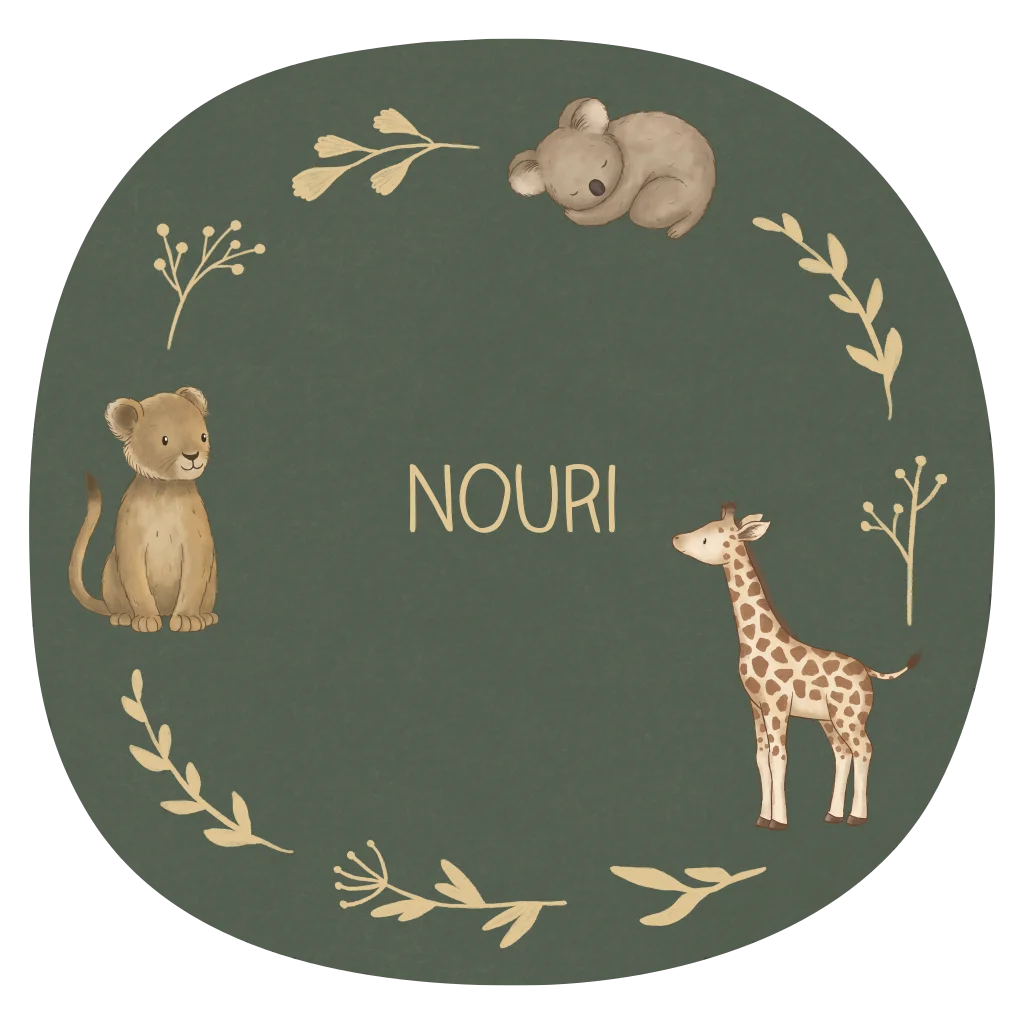 Een speels rond geboortekaartje met safari dieren. Vrolijke illustraties van een leeuwtje, koala en een girafje.