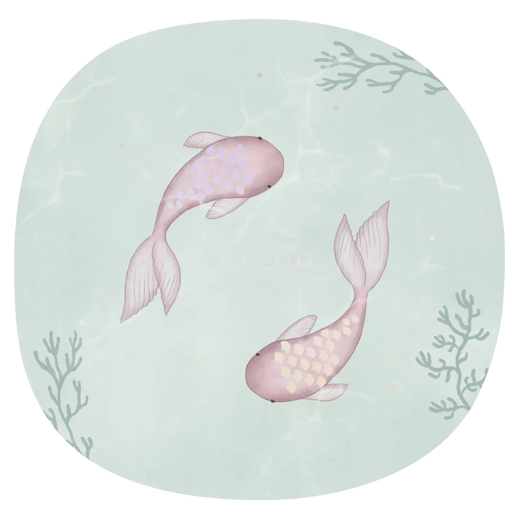 Een origineel rond geboortekaartje met een illustratie van twee visjes die in helder blauw water zwemmen. De schubben, de naam en stipjes zijn afgewerkt met glinsterend holografisch folie. Pas het kaartje gemakkelijk aan in de editor.