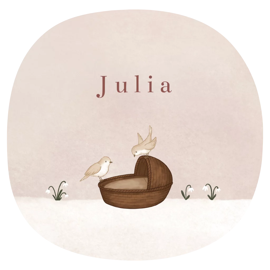 Lief winters geboortekaartje met een wiegje en twee vogeltjes. Dit warme geboortekaartje is een prachtige geboorteaankondiging voor jullie kleintje! Pas het kaartje eenvoudig aan in onze editor.