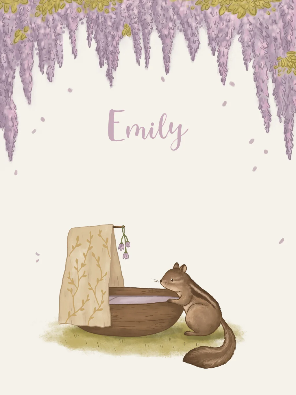 Poster met een lieve en dromerige illustratie van een eekhoorntje bij een wiegje onder de blauwe regen. Pas de poster eenvoudig aan in de editor!