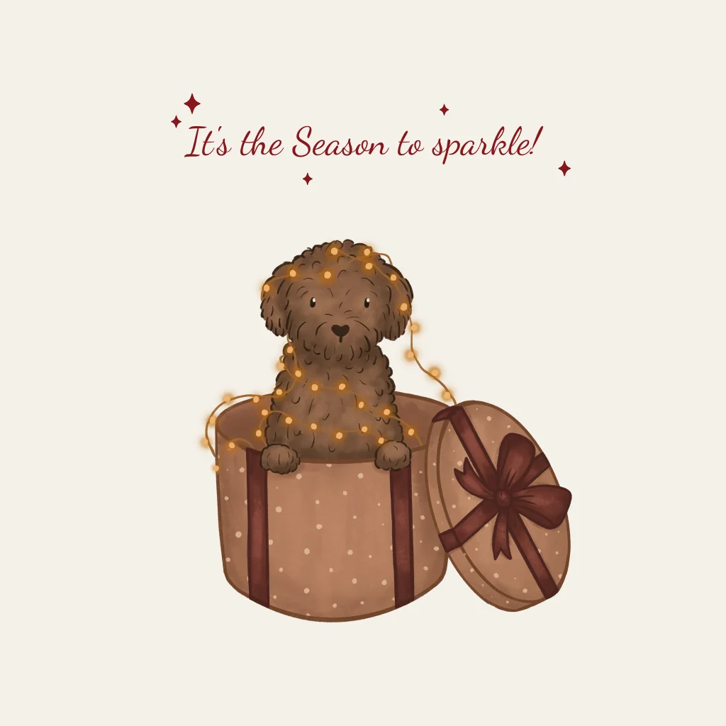 Feestelijke kerstkaart met een hondje in cadeau! Verstuur dit vrolijke kaartje naar je familie en vrienden. Pas het ontwerp eenvoudig aan in de online editor!