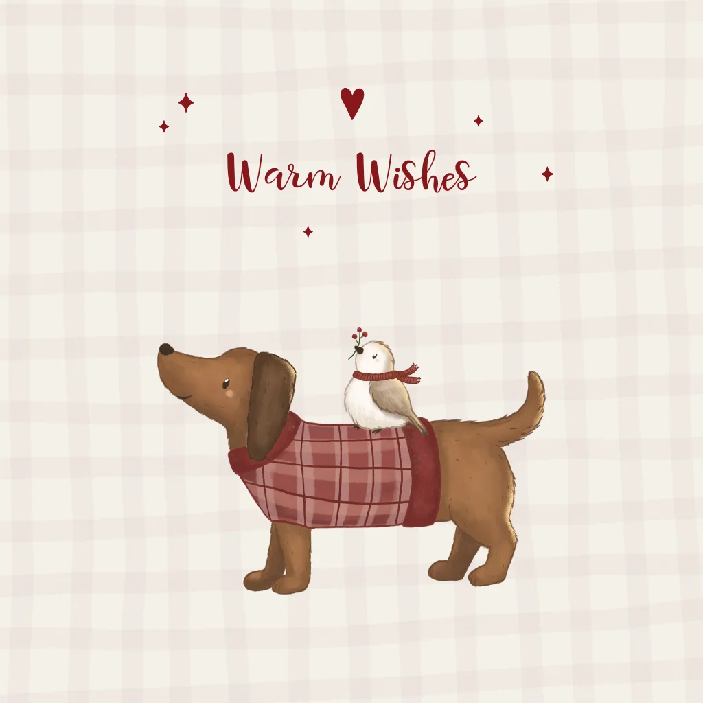 Een lieve kerstkaart met een teckel in een geruite truitje en een fluffy vogeltje op zijn rug. Pas de kerstkaart eenvoudig aan in de online editor!