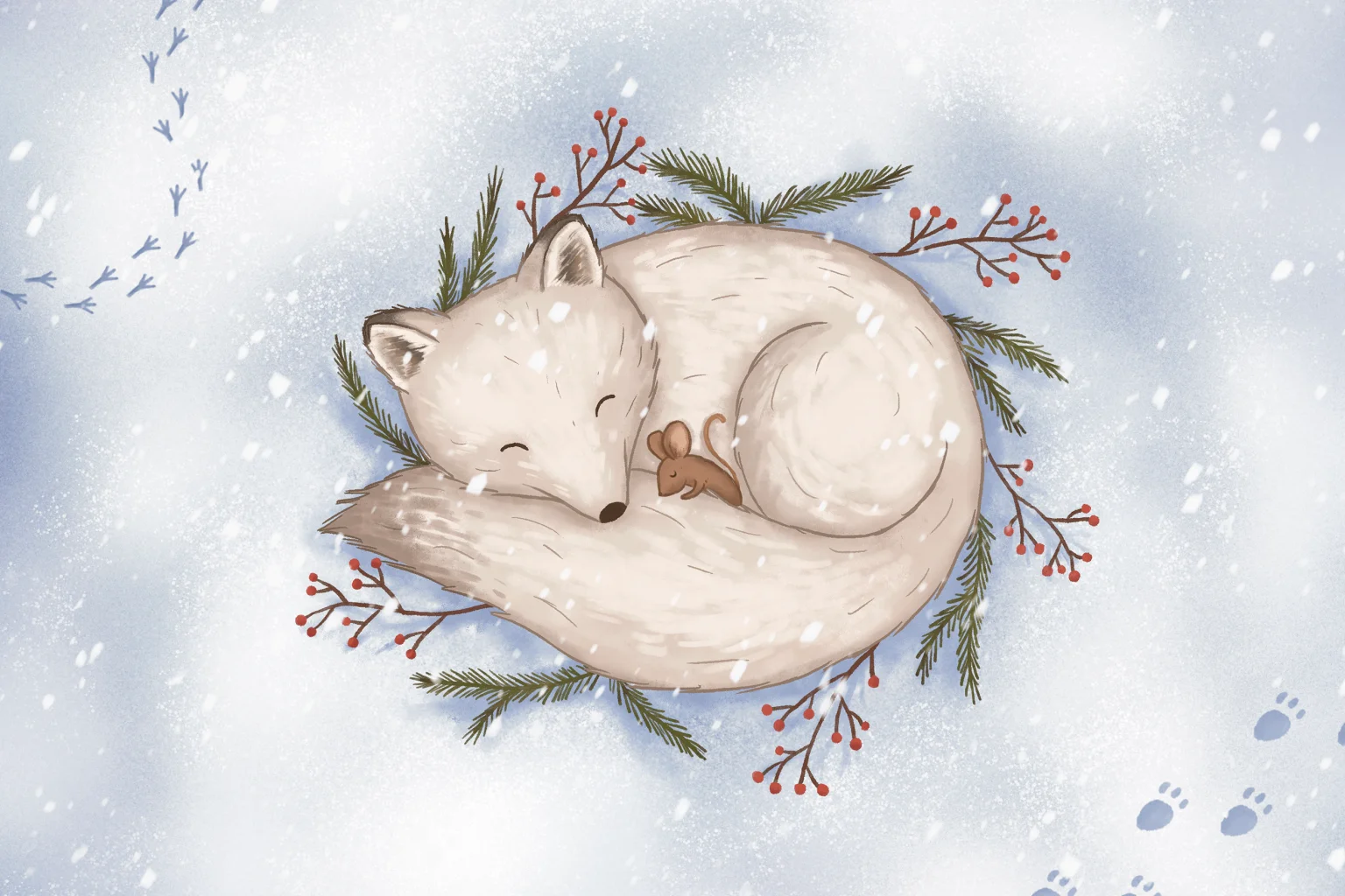 Een lief winters kaartje met een vosje en een klein muisje die knus bij elkaar liggen. Verstuur aankomende feestdagen naar je familie en vrienden deze uniek geïllustreerde kerstkaart!
