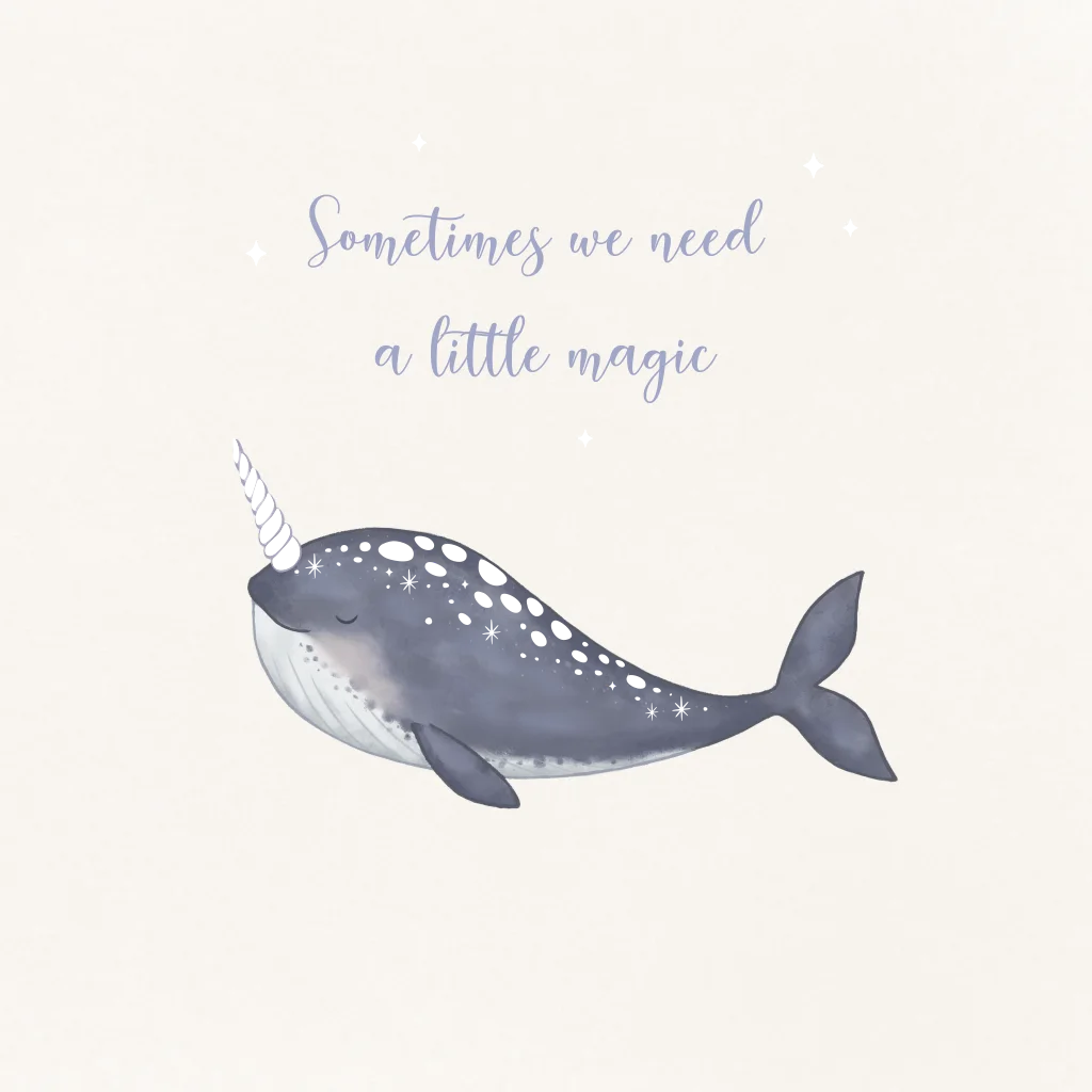 Een magisch kaartje van een narwal. De hoorn en vlekjes zijn afgewerkt met holografisch folie. Op de kaart staat de tekst 'Sometimes we need a little magic.' Pas het kaartje gemakkelijk aan in de onze editor.