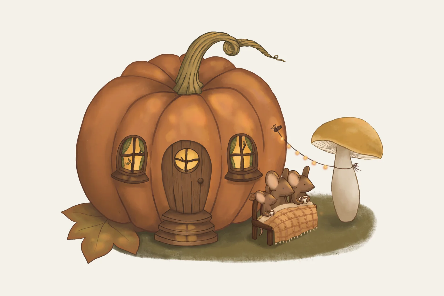 Gezellige, warme herfst kaart van een pompoenhuisje en een gezin van muisjes. Pas de kaart eenvoudig aan in de online editor. Liever maar één muisje bijvoorbeeld, dat kan ook!